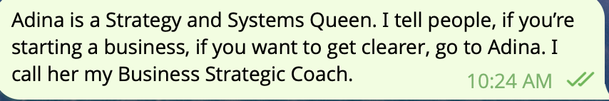 ✔ High-touch visibility, content, and messaging private business coaching over 6 weeks (2 private Zoom sessions; unlimited voice/text coaching via Telegram)